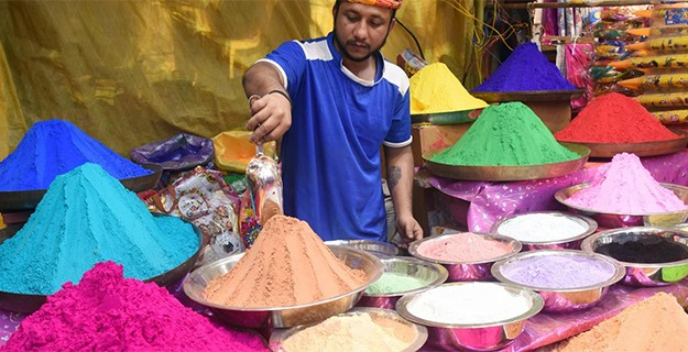 KOLKATA, India.- Un hombre prepara su puesto para la venta de polvos de colores con los que celebran el fin del invierno, el amor de Krishna y Radha y la victoria del bien sobre el mal.