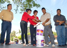 Se entregaron 200 cubetas de impermeabilizante, 2 para cada familia, sumando 100 apoyos de impermeabilización; así como 40 bultos de lámina.