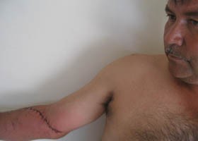 Con una herida de diez centímetros en el antebrazo derecho y una vena lesionada resultó Miguel Valdez a causa de la golpiza que, asegura, le propinaron los policías Carlos Trujillo Castro y Luis Montiel Aguiluz.