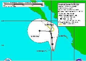 El centro de la tormenta "Paticia" se localizó a las 8 a. m. a 425 Km del extremo sur de la península de Baja California, se mueve con dirección nor-noroeste a 13 Km/h con vientos máximos sostenidos de 75 Km/h y rachas de 95 Km/h.