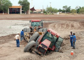 El tractor se hundió parcialmente y tuvo que ser rescatado por otros tractores.