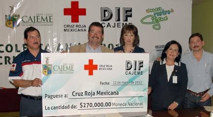 Con la entrega de recursos por el orden de los 270 mil pesos por parte del Ayuntamiento de Cajeme, el Alcalde Manuel Barro Borgaro dio inicio a la colecta nacional 2012 de Cruz Roja Mexicana en el municipio.