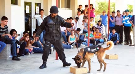 En la exhibición, los estudiantes constataron la eficiencia del par canino, mismo que para llegar a ser perros policías recibieron una educación de tres años en un centro de adiestramiento de Guadalajara Jalisco.