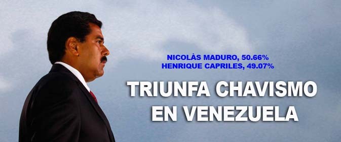 CARACAS.- Nicolás Maduro resultó electo Presidente de la República al obtener 7.505.338 votos que representan el 50,66% de la votación de este domingo 14 de abril frente a 7.270.403 del aspirante de la oposición Henrique Capriles que consiguió un 49,07%, anunció la presidenta del Consejo Nacional Electoral, Tibisay Lucena.