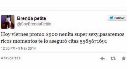 En el grupo que realiza promociones se encuentran también @ErikaSexxy, (“promo especial solo los hoteles de la zona de Huipulco” o “una hora 1200 amiga y yo 2500”); @SoyBrendaPetite (“hoy viernes de promo $900 nenita super sexy, pasaremos ricos momentos te lo aseguro citas…”.