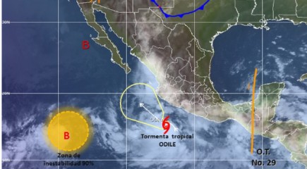 La tormenta tropical “Odile” se ubica a 395 kilómetros al sur de Manzanillo, Colima, desplazándose lentamente al oeste a 4 kilómetros por hora (kph), con vientos sostenidos de 105 kph y rachas de hasta 120 kph.