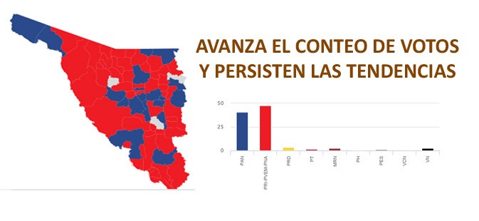 Al avanzar el conteo de actas electorales en Cajeme y en el resto de Sonora se mantiene la tendencia favorable a los candidatos del PRI, partido que se alza con una victoria definitva en la contienda por el Gobierno del Estado, los municipios más importantes -Hermosillo y Cajeme- así como en las diputaciones locales y la federal de Cajeme.