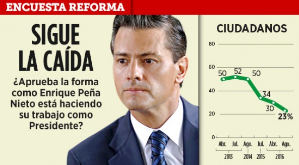 CD. DE MÉXICO.- Una encuesta del diario Reforma realizada a mil 200 adultos, del 4 al 7 de agosto pasado, reveló que se ha incrementado la desaprobación a la gestión del presidente Enrique Peña Nieto, particularmente en educación y seguridad.