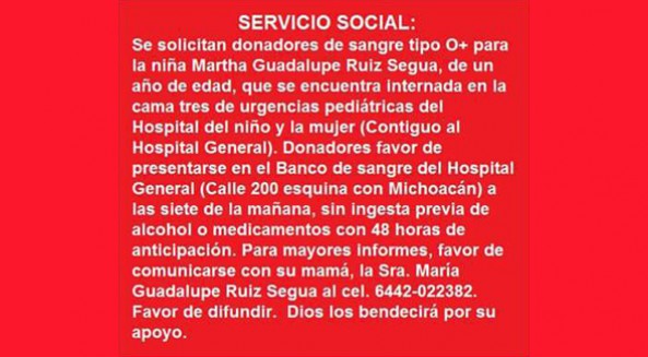 Se agradece la atención y colaboración de nuestros lectores para la solicitud que nos han hecho llegar familiares de la niña Martha Guadalupe Ruiz Segua, de un año de edad.