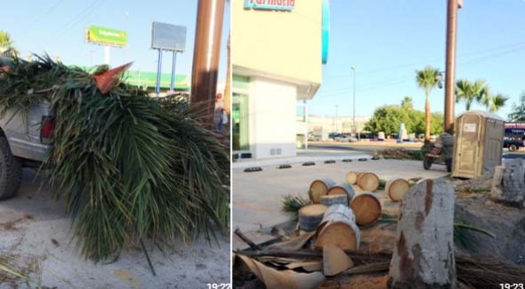 Varias palmeras que se encontraban en la calle Yaqui esquina con Guerrero, colonia Del Valle, fueron taladas para abrir paso al estacionamiento de una sucursal de Farmacia Guadalajara en ese lugar.