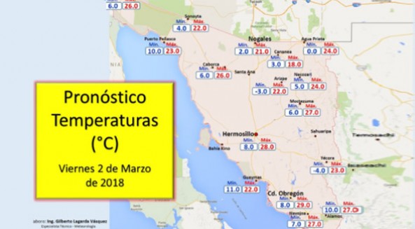 Se prevé que este fin de semana continúe el ambiente de frío a muy frío para Sonora, principalmente en el norte y oriente de la entidad, donde se pronostican temperaturas mínimas de -5 a 5 grados Celsius, en tanto para el centro y sur del estado se prevé temperaturas mínimas de 7 a 12 grados Celsius y máximas de 25 a 32, informa el Organismo de Cuenca Noroeste (OCNO) de la Comisión Nacional del Agua (Conagua).