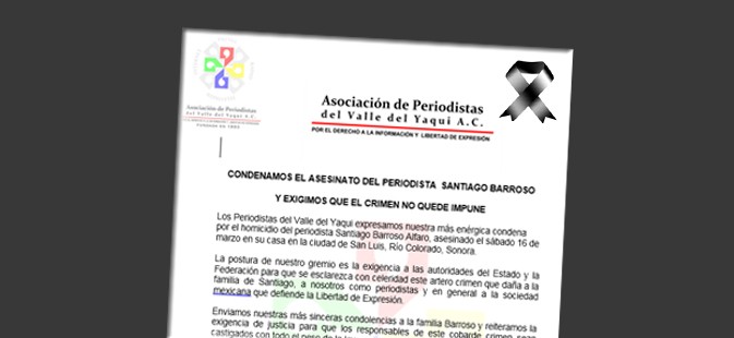 Los Periodistas del Valle del Yaqui expresamos nuestra más enérgica condena por el homicidio del periodista Santiago Barroso Alfaro, asesinado el sábado 16 de marzo en su casa en la ciudad de San Luis, Río Colorado, Sonora.