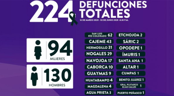 Casos Covid-19 en Sonora: 2,704 casos confirmados y 224 defunciones