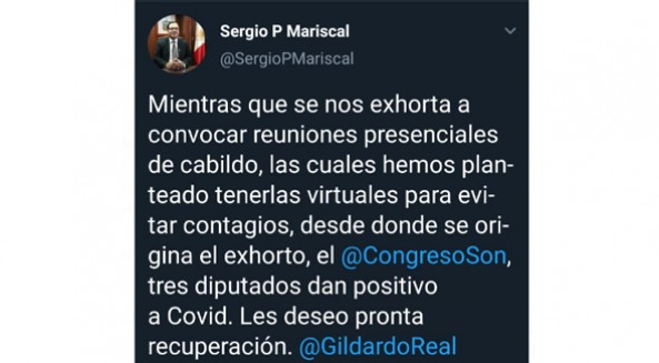 "Mientras que se nos exhorta a convocar a reuniones presenciales de cabildo, las cuales hemos planteado tenerlas virtuales para evitar contagios, desde donde se origina el exhorto, el @CongresoSon, tres diputados dan positivo a Covid. Les deseo pronta recuperación. @GildardoReal".