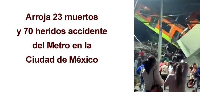 CDMX. Al menos 23 personas murieron y 70 resultaron heridas la noche del lunes al caer un tren del metro de Ciudad de México desde un puente que colapsó, informaron las autoridades. "Lamentablemente son 23 los fallecidos, uno de ellos en un hospital", dijo este martes a periodistas la alcaldesa de la capital mexicana, Claudia Sheinbaum, quien previamente había reportado 20 muertos en este siniestro.