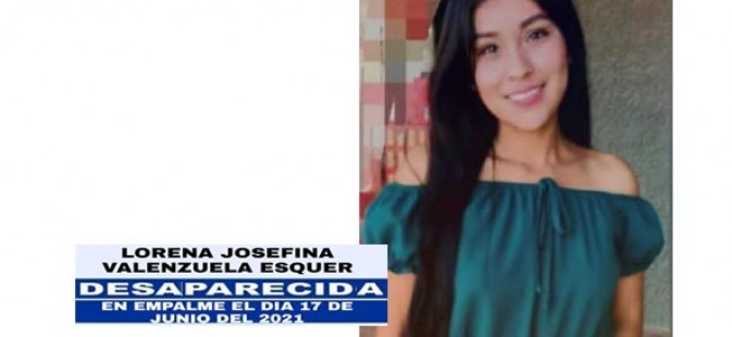 VÍCAM.- La noche del pasado jueves fue reportada ante las autoridades la desaparición de la jovencita Lorena Josefina Valenzuela Esquer, quien fue vista por última vez cuando se dirigía a trabajar en una maquiladora de Empalme.