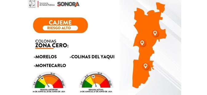 El secretario de Salud en el estado refirió que en la actualización del Mapa Sonora Anticipa, correspondiente del 21 al 27 de junio de 2021, se encontrarán en riesgo alto Hermosillo, Caborca, Cajeme y Navojoa; en riesgo medio Nogales, Cananea, Agua Prieta, Huatabampo, San Luis Río Colorado y Puerto Peñasco y en riesgo bajo Empalme y Guaymas.