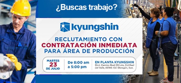 El martes 23 de julio la empresa Kyungshin realizará una jornada de reclutamiento de trabajadores con contratación inmediata para su área de producción, dio a conocer el Ayuntamiento de Cajeme.