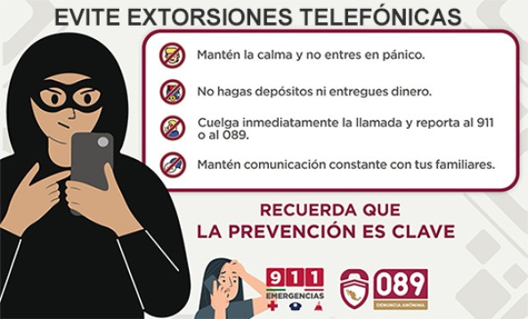 Ante esta situación, la SSPM recomienda no proporcionar información personal o comercial, no continuar la llamada, cuelgue de inmediato y reporte al número de emergencias 9-1-1 o al 089 para denuncia anónima.