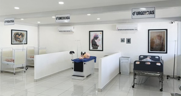 Cuenta con secciones para práctica de enfermería en especialidades como ginecología, pediatría y otras de primeros auxilios.