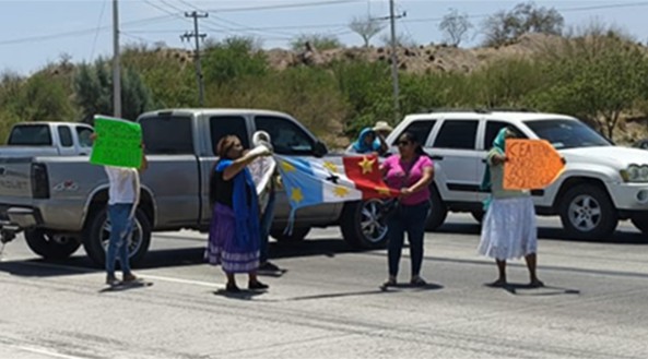 Integrantes del pueblo yaqui Loma de Guamúchil bloquearon la carretea Internacional este día a la altura de esa comunidad, frente a la estatua del danzante.