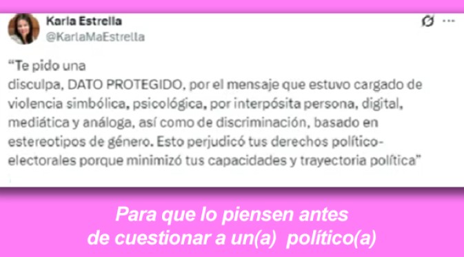 La ciudadana Karla Estrella publicó la disculpa pública a DATO PROTEGIDO, tras haber sido sancionada por violencia política en razón de género contra una diputada