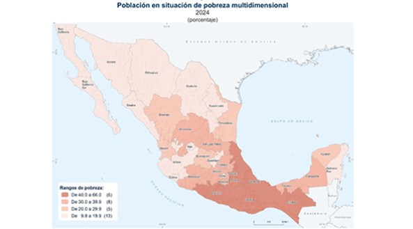 En 2024, las cinco entidades federativas con los porcentajes más altos de población pobre fueron Chiapas, con 66.0 %; Guerrero, con 58.1 %;  Oaxaca, con 51.6 %; Veracruz, con 44.5 %; y Puebla, con 43.4 por ciento.