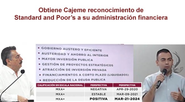 Standard & Poor's Global (S&P Global), un de las tres firmas más reconocidas a nivel internacional que evalúan la capacidad crediticias y las finanzas de entes públicos, ratificó la calificación crediticia de mxA+ a Cajeme como Positiva.