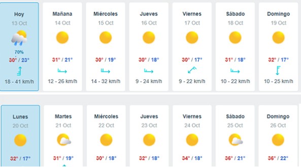 A partir del 21 de octubre se pronostica una recuperación ligera de los valores mínimos, con 21 - 22° durante las noches.