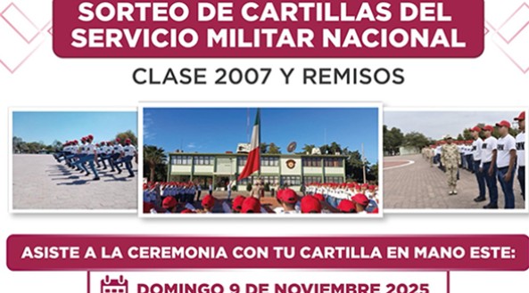La Junta Municipal de Reclutamiento de Cajeme invita a los jóvenes de la Clase 2007 y a remisos que realizaron su trámite de cartilla del Servicio Militar Nacional (SMN) a participar en el Sorteo Anual de Cartillas, que se llevará a cabo el domingo 9 de noviembre en las instalaciones del Estadio Manuel “Piri” Sagasta.