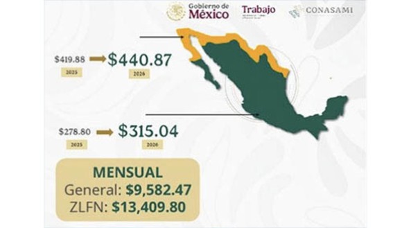 El gobierno federal anunció un incremento del 13% al salario mínimo general a partir del 1 de enero de 2026. Con este ajuste, la remuneración diaria pasará de 278.80 a 315.04 pesos, equivalente a 9,582.47 pesos mensuales. El secretario del Trabajo, Marath Bolaños, destacó que el acuerdo fue alcanzado por consenso entre sectores económicos.