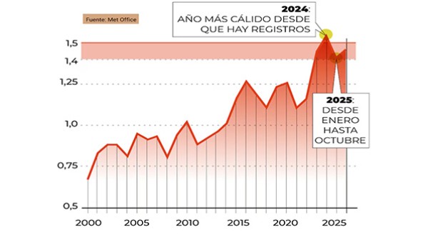 Esta proyección se encuentra apenas por debajo del máximo histórico de 1,55 °C registrado en 2024, que representa el mayor valor documentado hasta la fecha. Según el Met Office, la proyección “sugiere que es probable que sea uno de los cuatro años más cálidos para la temperatura media global”.