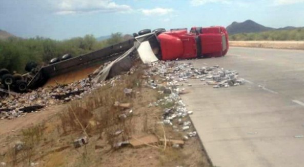 HERMOSILLO.- Un tráiler que remolcaba cajas cargadas con cerveza se volcó en la carretera Hermosillo-Guaymas, lo que provocó el cierre temporal de la rúa e innumerables actos de rapiña.