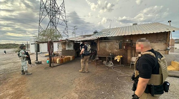 SONOYTA.- La Fiscalía General de Justicia del Estado de Sonora (FGJES), a través de la Agencia Ministerial de Investigación Criminal (AMIC), en coordinación con la Secretaría de la Defensa Nacional (DEFENSA), la Fiscalía General de la República (FGR), la Policía Federal Ministerial (PFM) y diversas autoridades, ejecutó con éxito una diligencia de cateo en un restaurante ubicado a la altura del kilómetro 14 de la carretera Sonoyta-San Luis Río Colorado, asegurando diversos indicios de desvío de hidrocarburos.