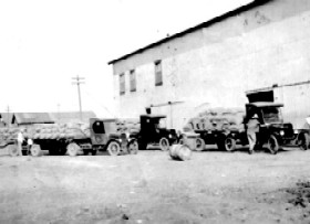 En la foto de hoy (¿1924 – 1925?) aparece una fila de camiones de carga Fordson esperando su turno para descargar en un molino arrocero ubicado al sur de la calle Sufragio Efectivo.